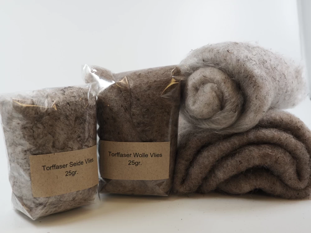 In unserem Atelier verarbeiten wir die Ausgangsprodukte Torffaser, Wolle und Seide zu Vliesen, Garnen und schliesslich zu gewobenen Stoffen und gestrickten oder gefilzten Fertigprodukten. Wir bieten Ihnen diese «Zwischenprodukte» auch zum Verkauf an. So können Sie bei uns Torffaser-Wolle- oder Torffaser-Seide-Vliese natur oder pflanzengefärbt kaufen, ebenso die daraus gesponnenen Garne oder handgewobenen Stoffe. Pflanzenfärbungen werden mit Naturprodukten vorgenommen. Dadurch gibt es immer Abweichungen bei den Farbtönen. Das Farbangebot umfasst die Farben des Regenbogens, leicht verdunkelt durch den Torffaseranteil. Wir halten immer einen Vorrat auf Lager. Bei grösseren Mengen und/oder speziellen Farben nennen wir Ihnen gerne die notwendige Lieferzeit.