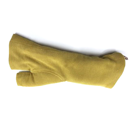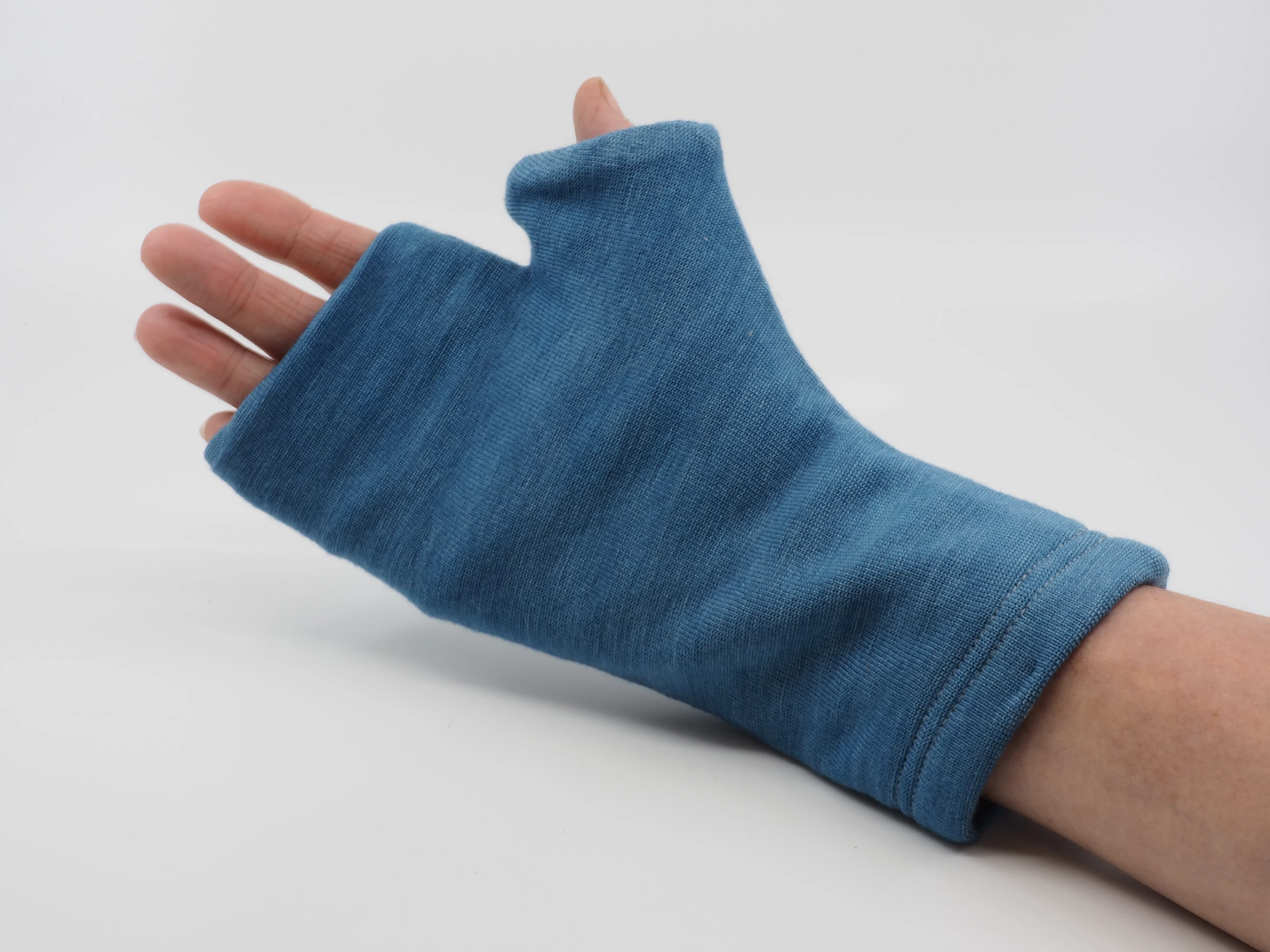 Für den Daumen-Handgelenkwärmer verwenden wir ein Wolle-Seidetrikot und füllen ihn mit unserem Torffaser-Seide-Vlies. Er wirkt wärmend und schmerzlindernd.
