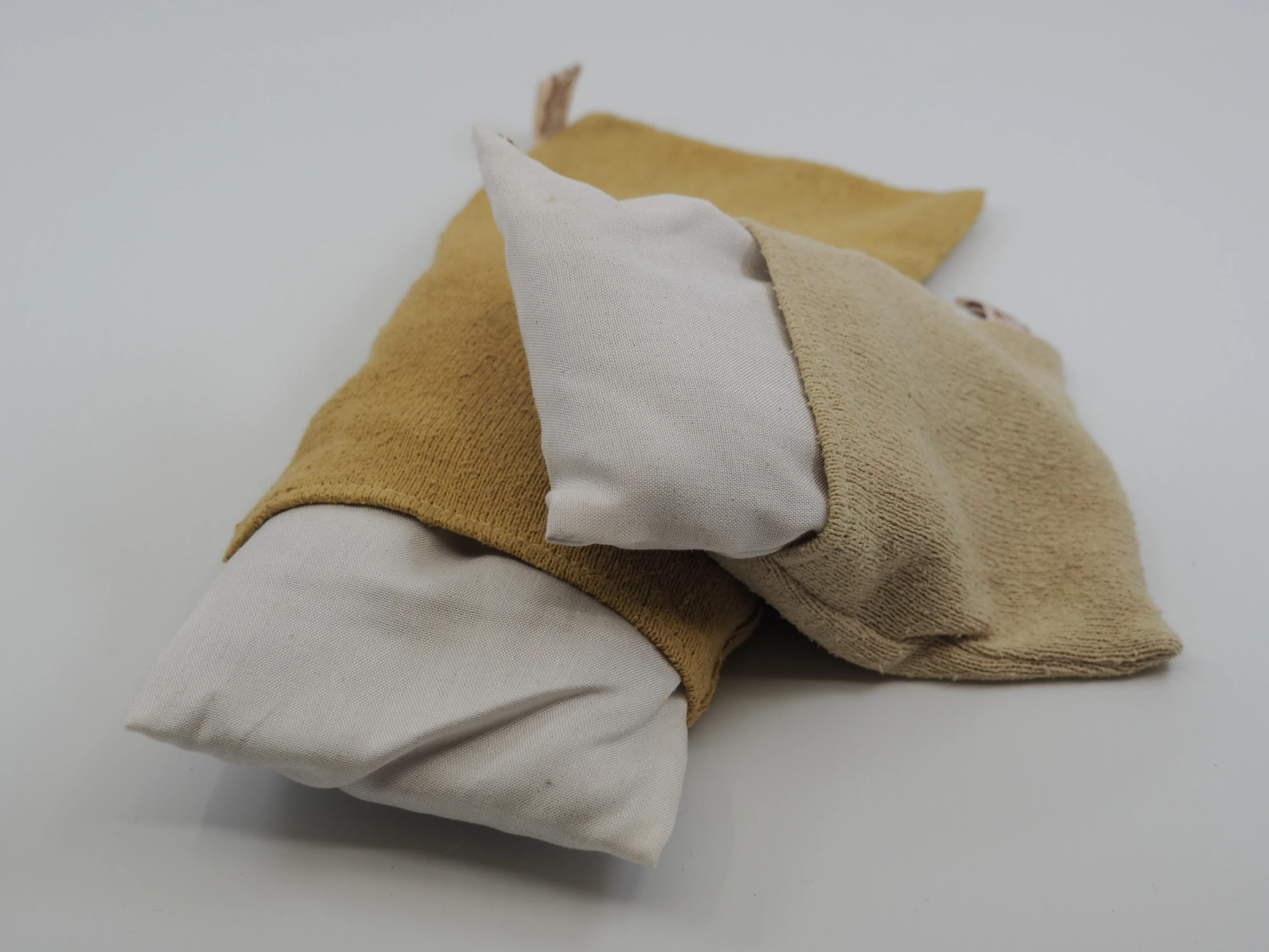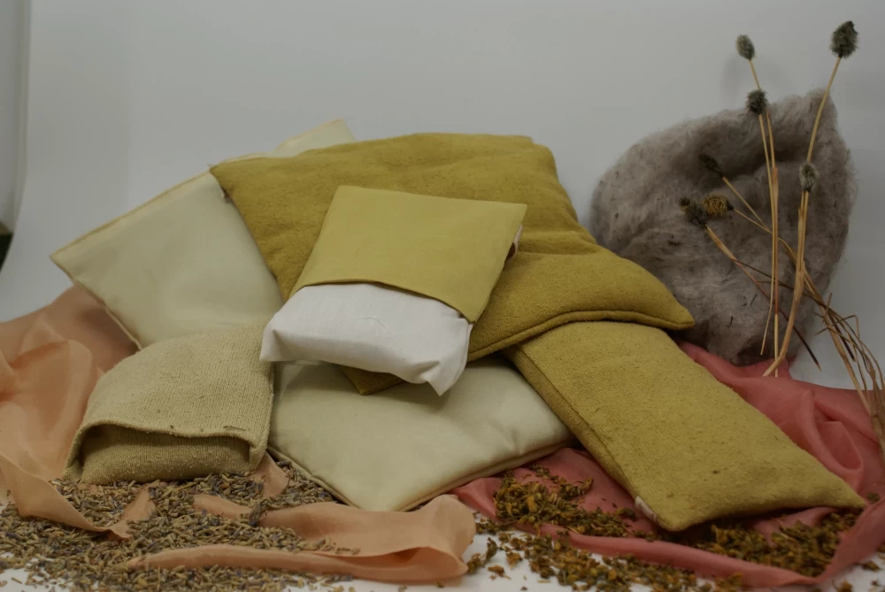Für unsere Wärmekissen wird der Aussenstoff – Seide in verschiedenen Qualitäten – mit den Heilpflanzen Johanniskraut oder Lavendel eingefärbt. Den sorgfältig eingefärbten Stoff imprägnieren wir vor dem Nähen mit Torffaser-Essenz.