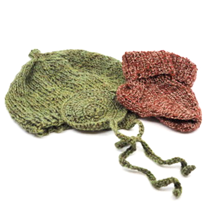 Wir bieten Mützen in vielen Farben und Mustern an, handgestrickt aus Torffaser-Wolle für den Winter und Torffaser-Seide für den Sommer und Drinnen.