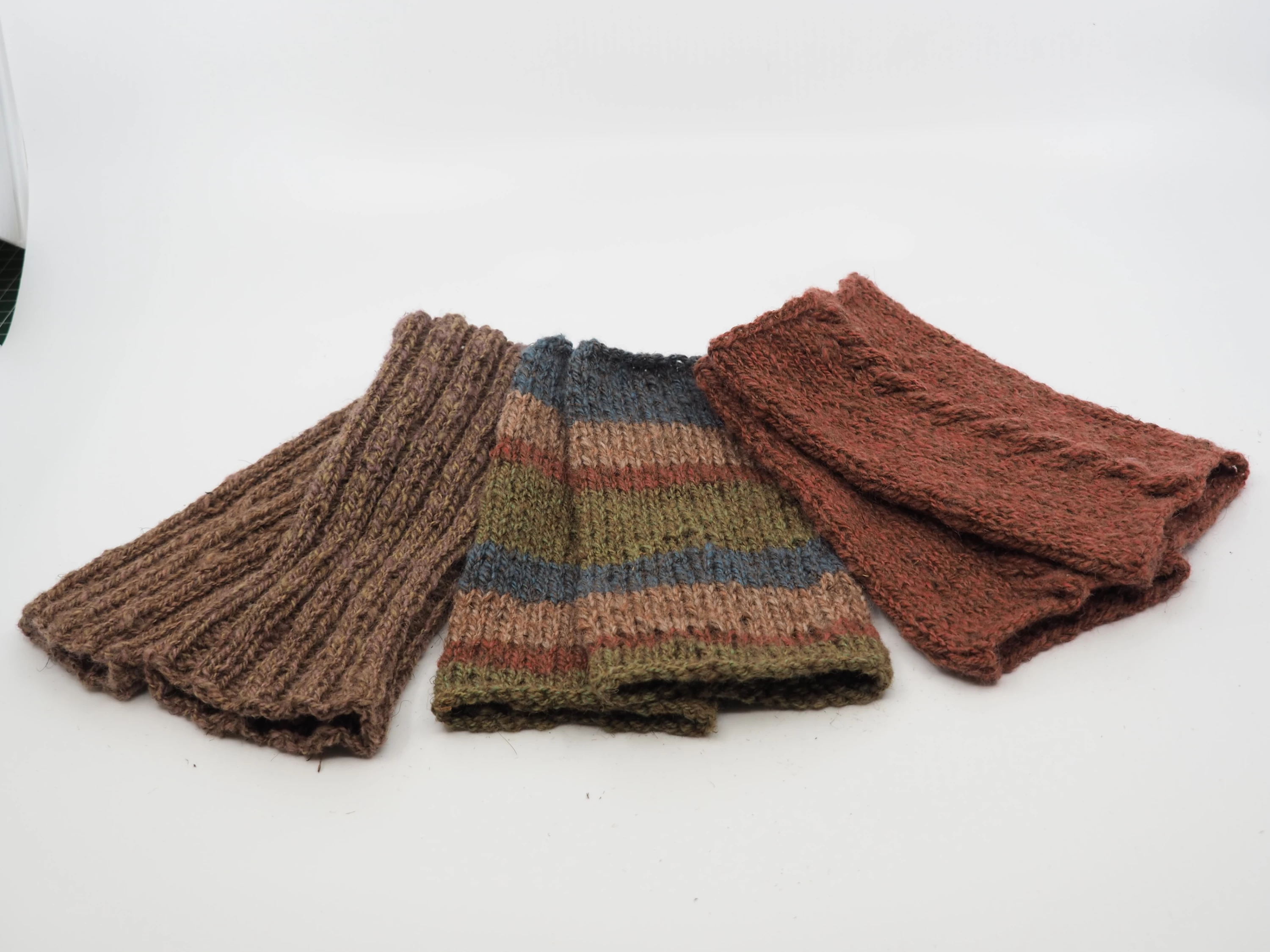 Aus Torffaser-Wolle und Torffaser-Seide stricken wir von Hand Pulswärmer und Stulpen. Auch hier gibt es verschiedene Farb- und Mustervarianten.