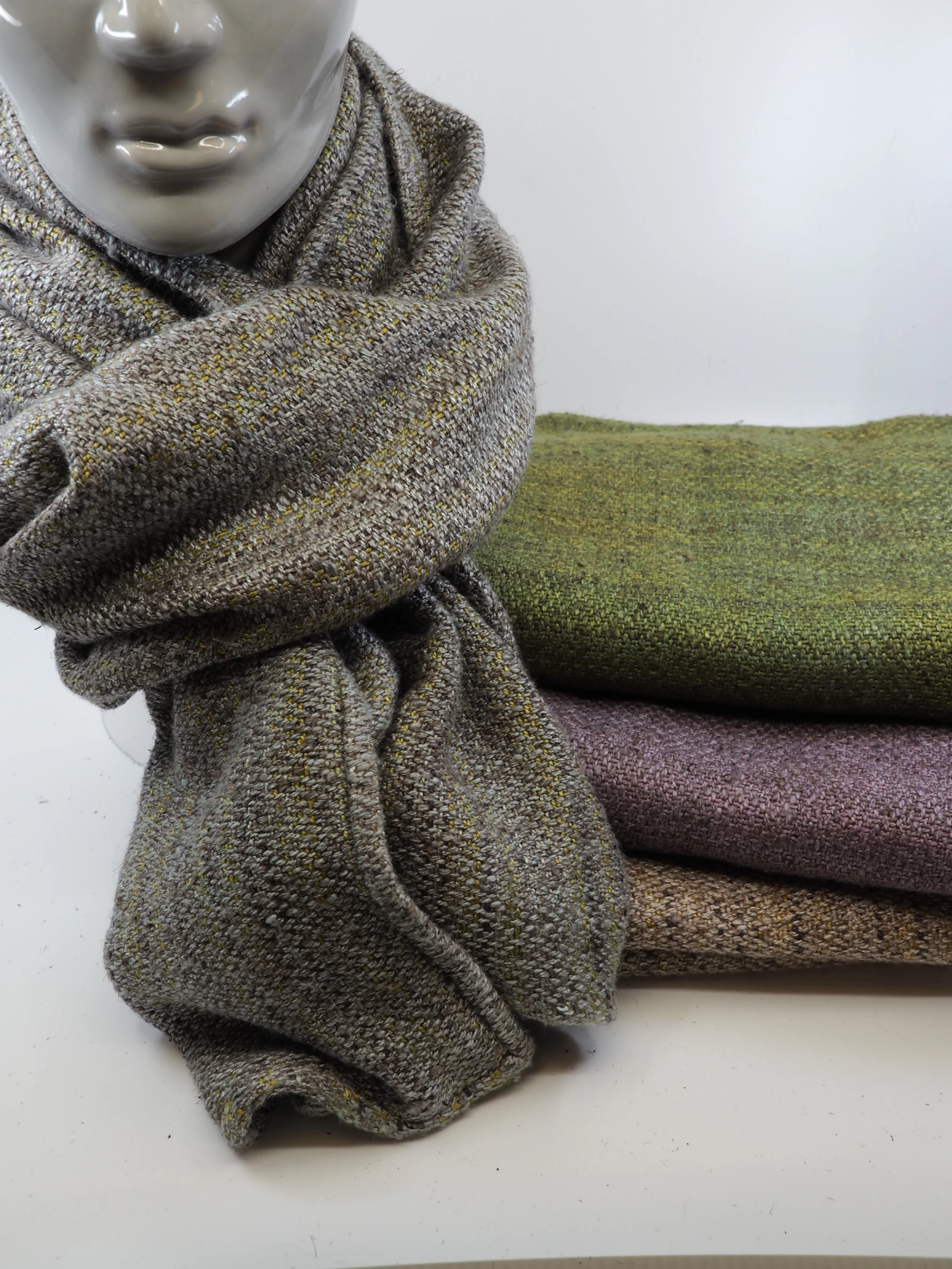 Aus Torffaser-Wolle oder Torffaser-Seide stricken wir von Hand einen wärmenden und schützenden Schal – auch für den Herrn. Tücher und Dreieckstücher wärmen die Schultern und geben eine leichte Hülle. Farbe und Muster können vielfältig variieren.